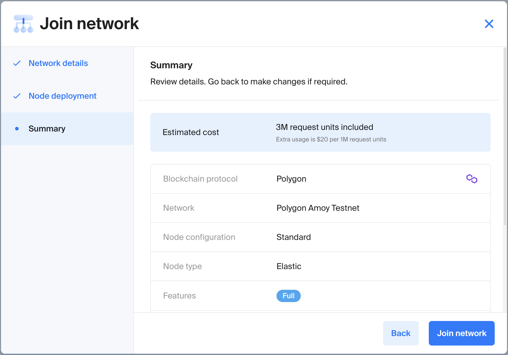 - Review the details under the “Summary” step and then click “Join network”. You will appear back in your project dashboard.