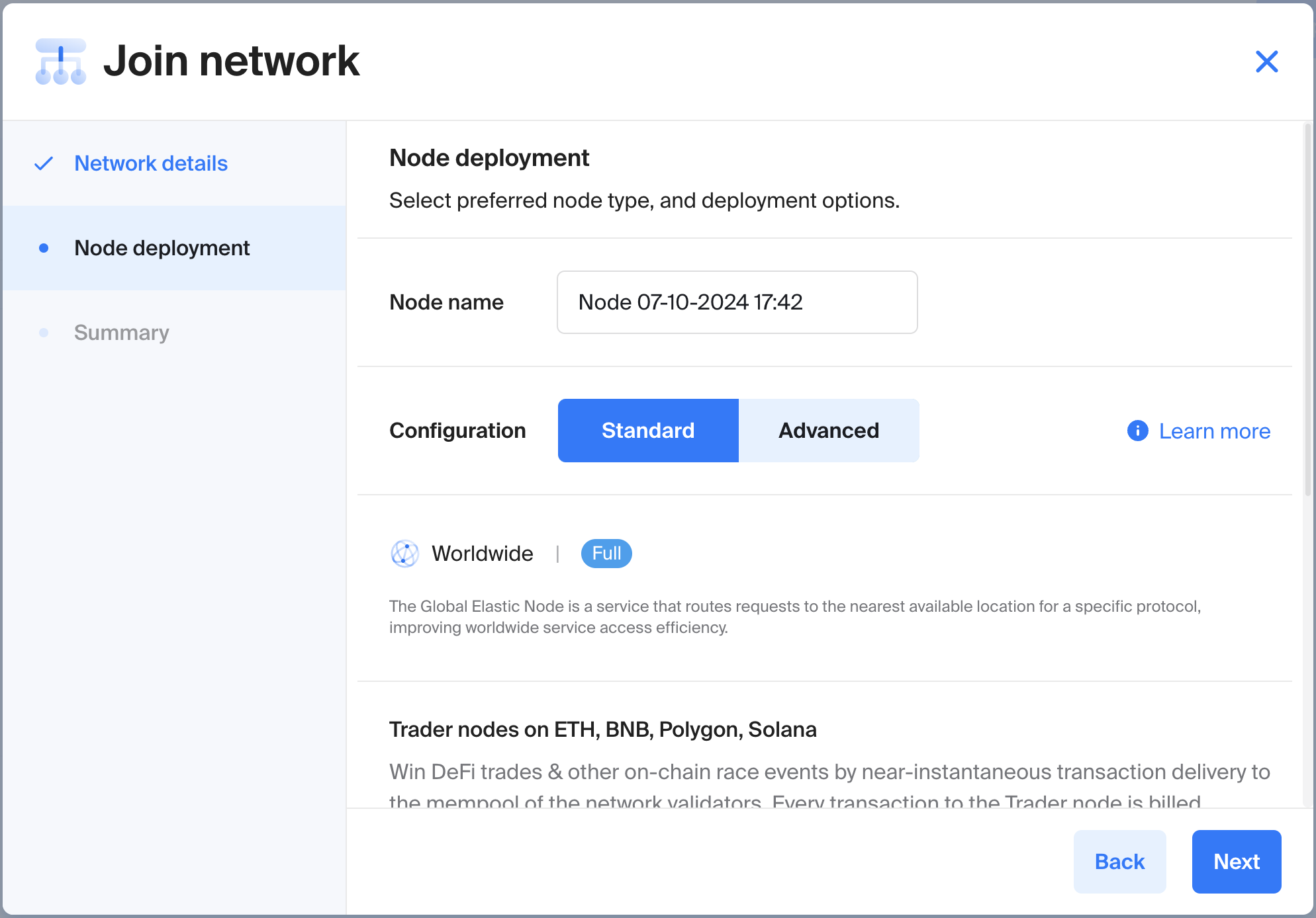 - If you are under Chainstack’s Developer plan, you will only be able to select the default options presented in the “Node deployment” step. This means you will choose “Elastic” for node type, “Full” for full node. Finally, name your node and click “Next”.