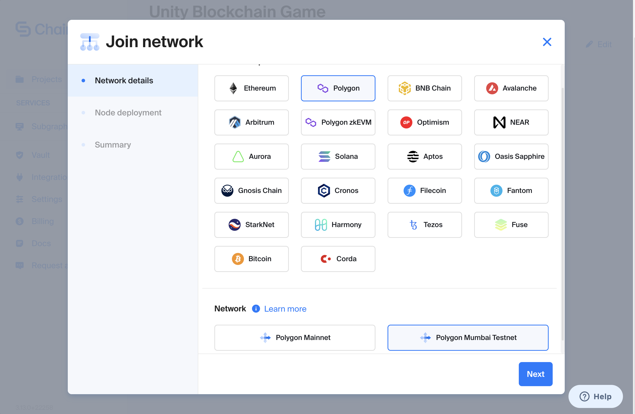 After clicking on the "Explore all Node Options" button, you will be presented with 3 required steps. In the first step “Network details”, you will select the EVM chain that your blockchain game will be making interactions with.