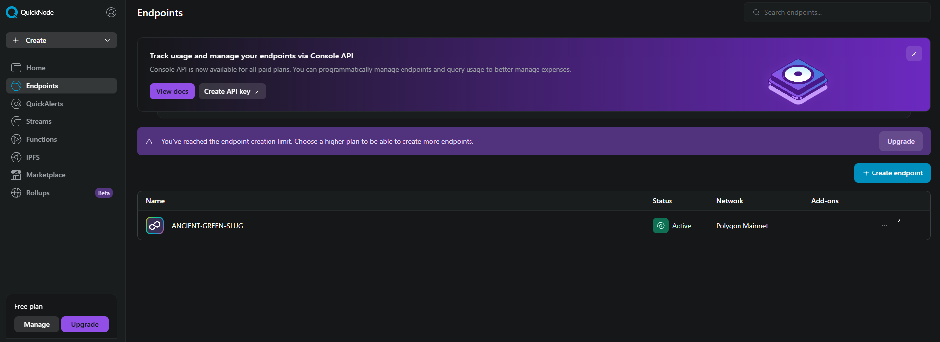 Note that the free plan QuickNode offers provides 10 million API requests per month. This should be enough for most testing and app development purposes. If your game requires more calls per month, we would suggest upgrading your plan.